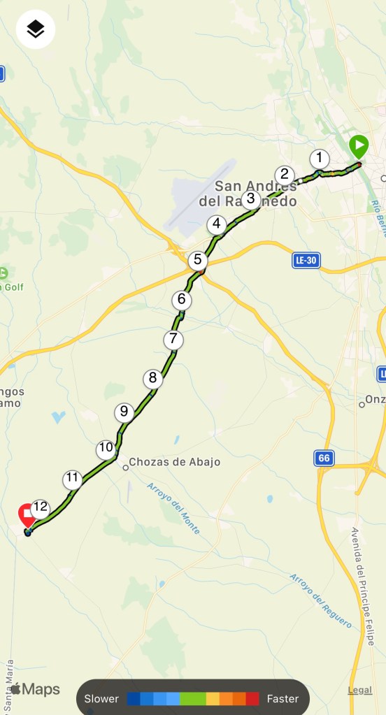 We’ve ended going off piste grabbing the last two beds in Villar de Mazarife! I did think I swapped one road for another as the first few kilometres was on a road, but it soon followed a gravel path through shrub land to our impromptu stop.