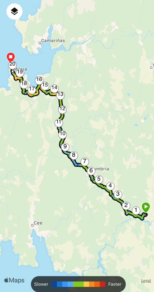 We came to the fork in the road, one way to Fisterra, the other to Muxia. We planned to do Muxia then tomorrow to Fisterra. Both are by the coast, but Fisterra is the true end. Muxia had really been made more popular due to the film.