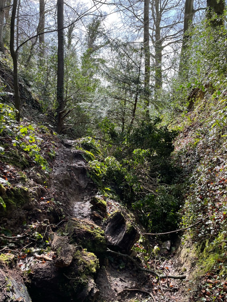 From here on it undulated but no more big climbs. As I descended into Wortley the path followed a narrow muddy ravine that was blocked by a fallen tree; another casualty from the storms.