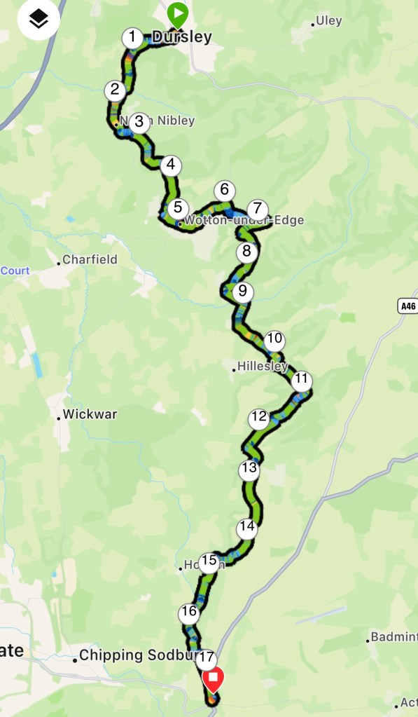 The late start and the mud underfoot slowed me down, however the uphills where now easier! Straight out of Dursley the ascent was devilish. Already offloading the tent had paid off.