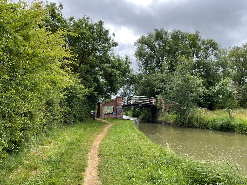 We continued along the canal, waving at the people on the narrowboats until we reached bridge 172. At this point the route leaves the towpath crossing open fields, over a wooden bridge and into a small wooded area. Here the footpath cuts through tall stinging nettles, that seemed to purposely want to inflict pain on us. With our arms raised in the air to avoid these pests, we passed through this stinging jungle as quickly as possible. This wouldn’t be our last nor our worst encounter with these hellish plants today.