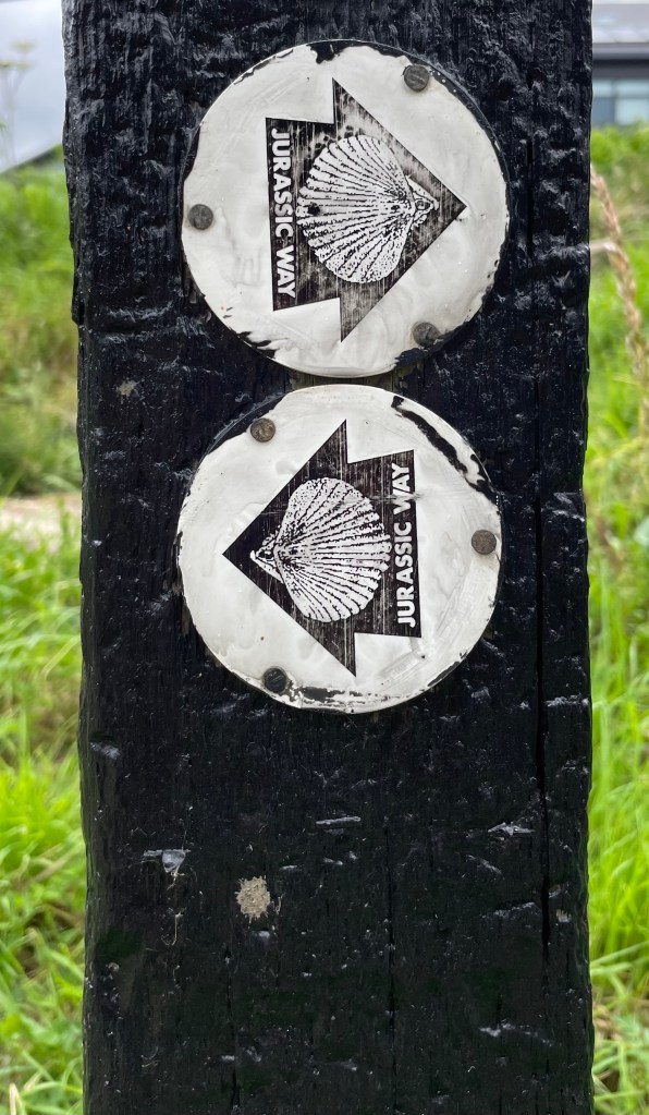 The route follows the Oxford Canal south out of Banbury for a mile and a half. It is a while before you first see a Jurassic Way marker; identifiable by a shell. In fact, unless you have a keen eye, it is easily missed. The over hanging trees covering the towpath, thankfully provided shelter from the brief rain showers.