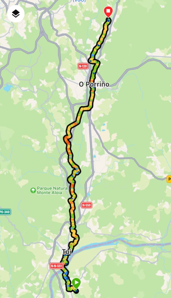 Today was also the hottest on the route, so it was tough going. We reached Porrino by 1pm, 20km in good time, despite the time travelling!We were so thirsty we had ordered Two lemonades and two 1l water bottles, and drank them like shots.