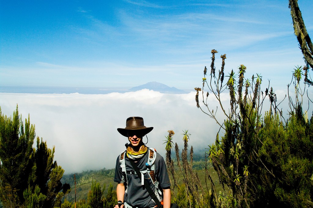 Once we emerged above the rainforest, we could see that we were above the cloud level. In the distance peeking out of this vast white fluffy carpet, stood Mt. Meru, in Kenya. For lunch we stopped at a group of boulders to eat our sandwiches. I perched on one, enjoying a cool breeze that picked up. It had been so hot to this point I had consumed all the water in my backpack bladder, all I had left was half of the contents of my water bottle.