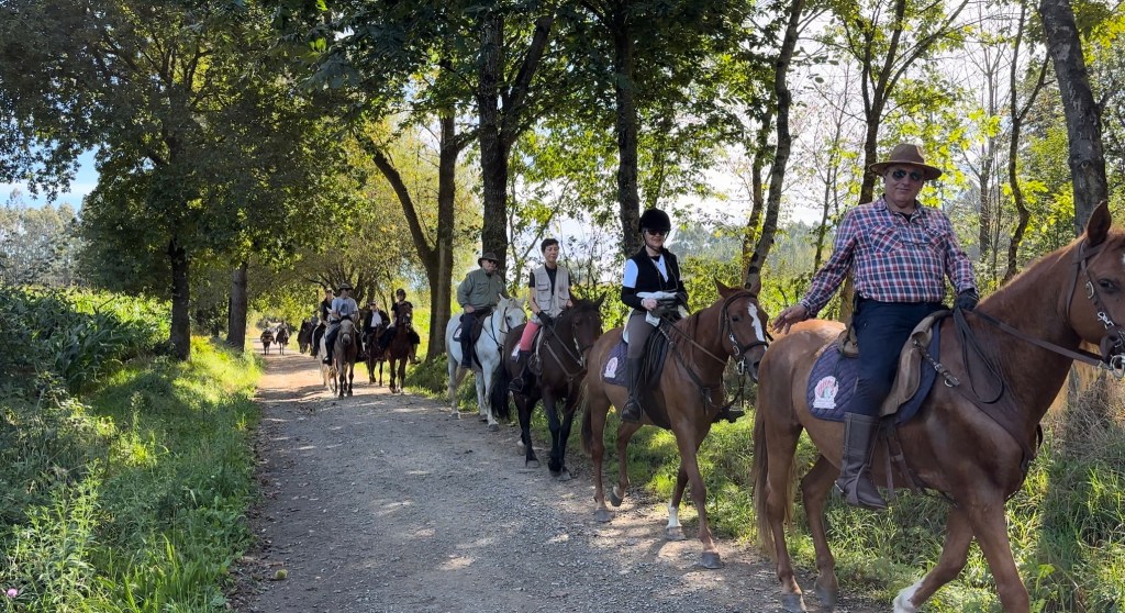 After the quick rest we continued on up and over a ridge into Ribadiso where we planned to stop for lunch. On our way down a large procession of pilgrims on horseback passed us.