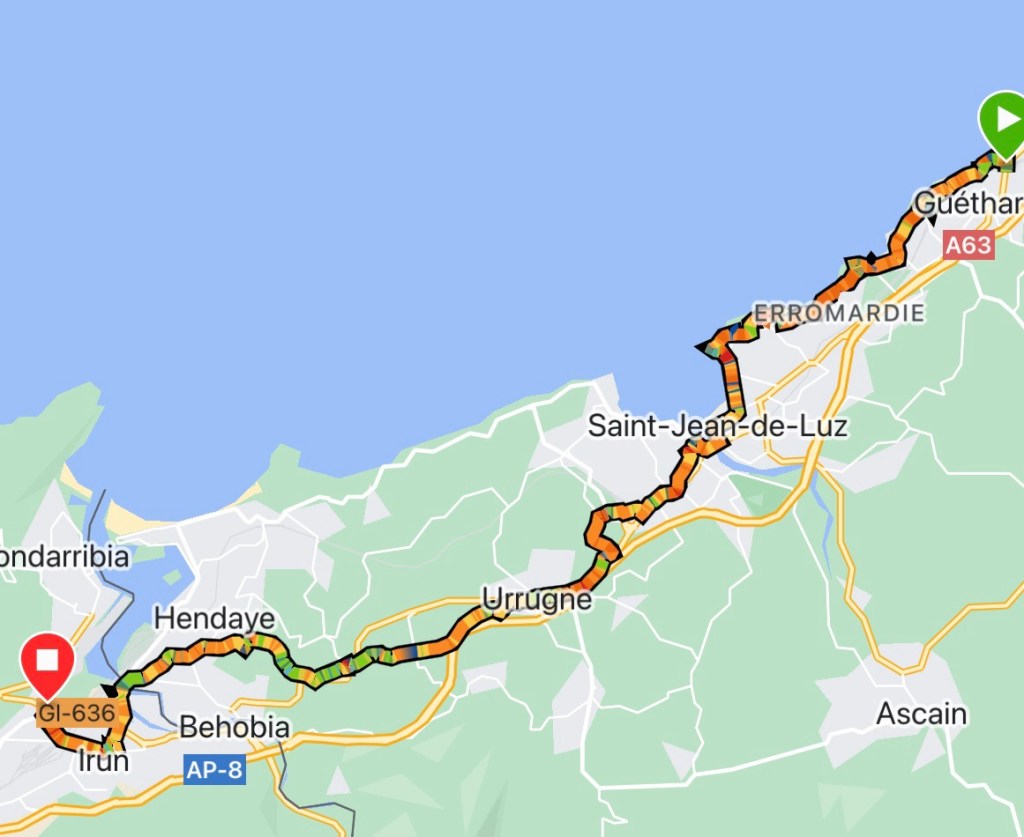 Breakfast sorted it wasn’t long before the route descended into St. Jean de Luz. A seaside town with a lovely vibe. The locals strolled along the promenade with their dogs, while paddle boarders went around the bay.