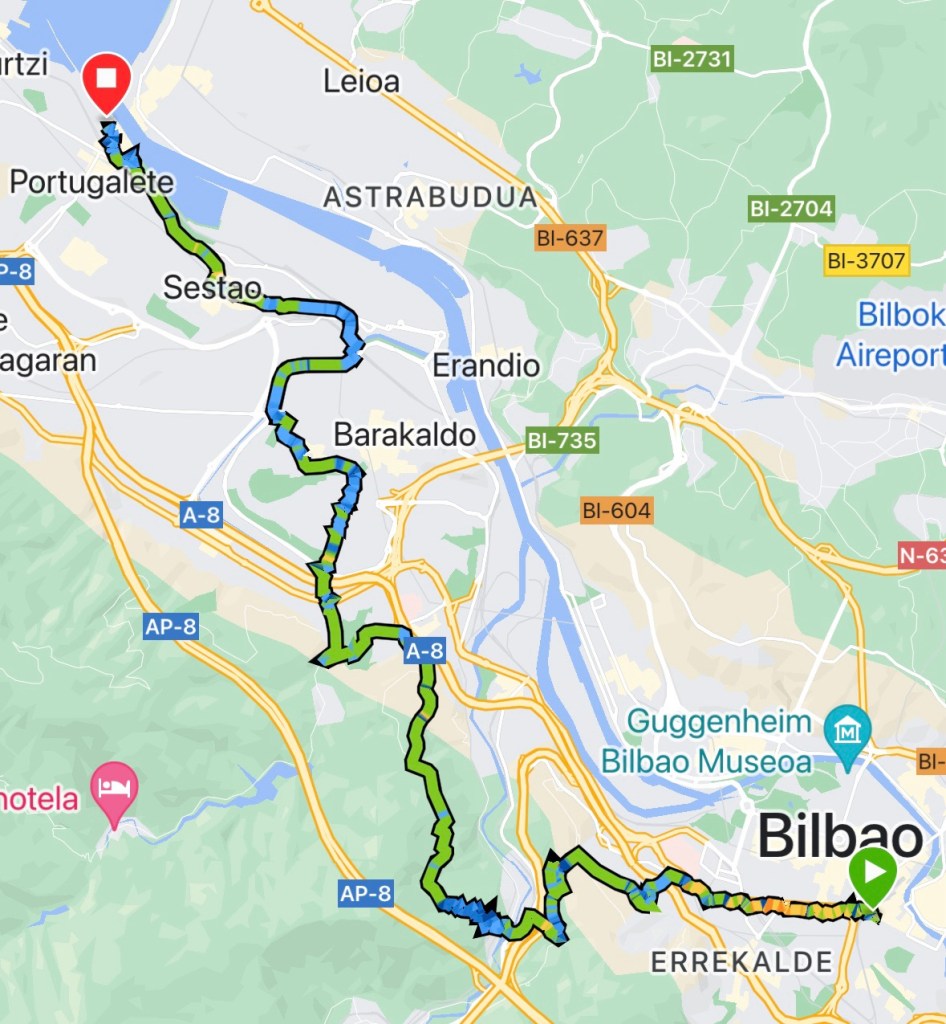After crossing the river, the Camino rises up past a train station and through Sestao. Another hive of activity with people going about to their business. It then gives a lofty views of the river Nerbiol Ibaia – the huge river that goes from the coast to the Bilbao.