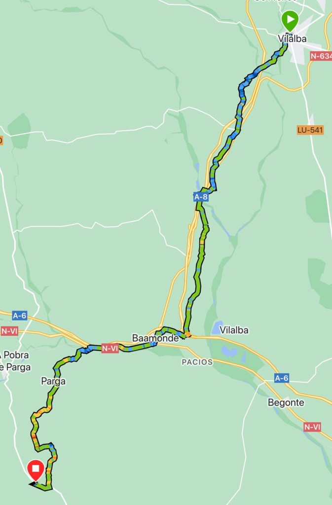 Elliot and I pulled head having a similar pace. Having good company the kilometres dropped away. The original plan was to stop at Miraz, but at 1730h we were still walking, being late in the day, we stopped at A Logoa.
