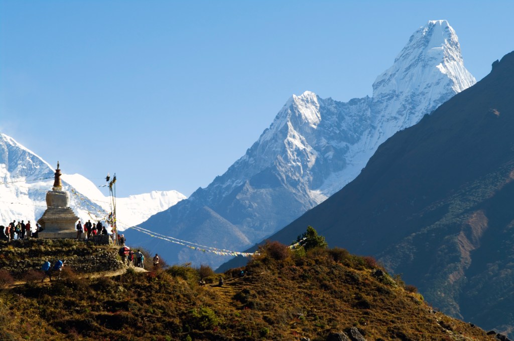 We continued onwards with our friend Cho Oyu watching over us. Before we knew it we arrived at the second lake. This one was larger and more scenic than the first, overlooked by a craggy snowcapped summit, stark against the vivid turquoise waters.