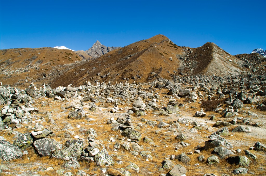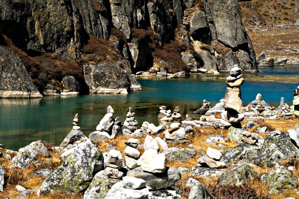 It wasn’t long before we reached the first of the three Gokyo Lakes. Only a small one, resembling a pond rather than a lake. Little cairns had been erected around the shore of the turquoise waters. Our head guide Rajesh said these waters were very pure and you could drink from it.